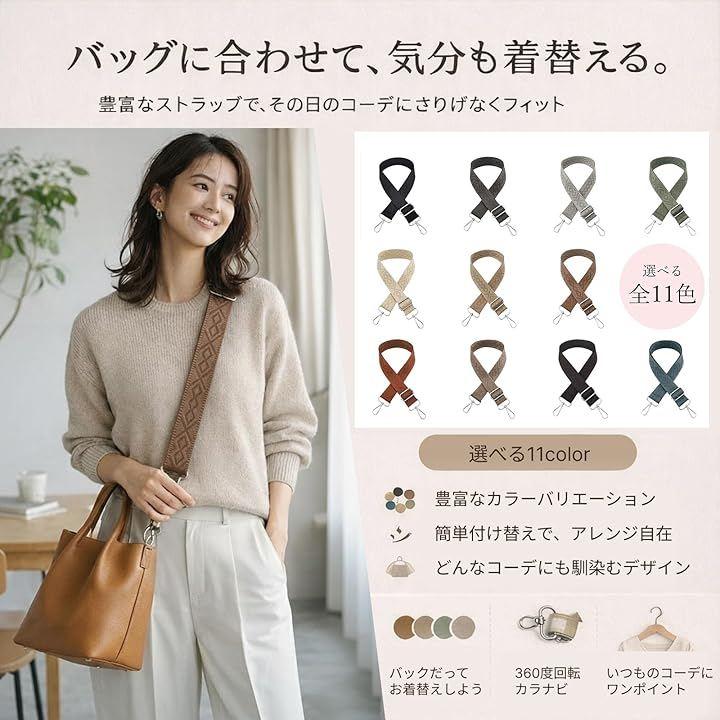 「商品仕様」 素材:ポリエステルx綿混紡(T/Cジャガード)/金具:360度回転カラビナ(シルバー)/幅:約3.8cm、長さ:約75~128cm、重量:約100g/用途:バッグ用ショルダーストラップ、シザーケース、スマホポーチなどに対応。