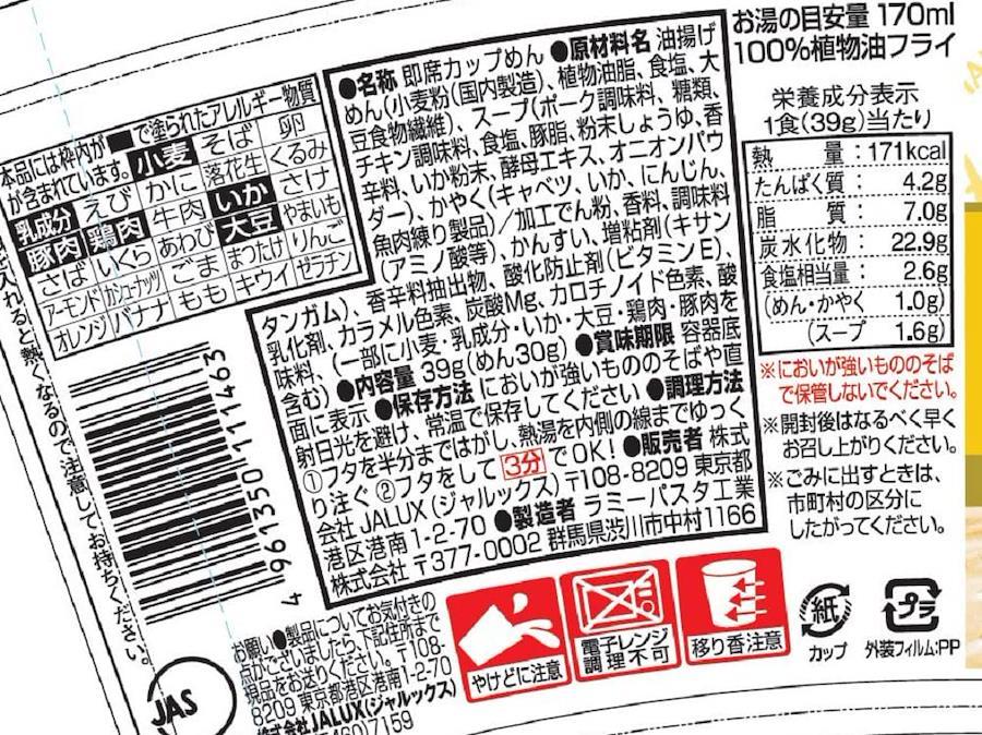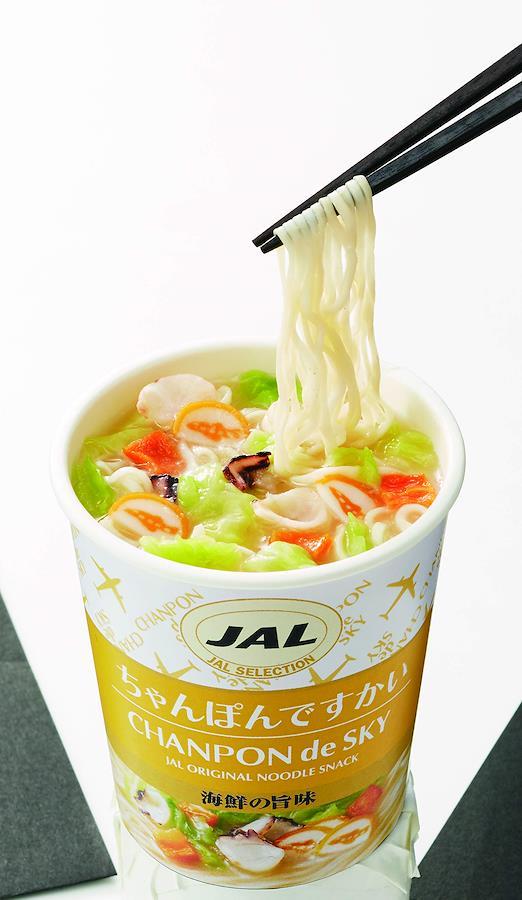 麺:気圧の関係でお湯の沸点が80~85度となる飛行中の航空機内にて使用することを目的に戻りやすく、のびにくい特性の麺を開発。その為、ポットのお湯でも再沸騰しなくても大丈夫。注いで3分で出来上がる。100%植物油を使用したフライ麺です。 スープ:海鮮の旨みを利かせたコクのあるスープ。 具材:キャベツ、いか、ダイスキャロット、飛行機の絵柄のかわいらしいオリジナルかまぼこが入っておりますので、見た目も楽しんでいただけます。合成保存料、着色料とも一切使用しておりません。 パッケージ:“飛行機"の絵柄で、空のイメージが感じられるかわいらしいパッケージデザイン。おやつや夜食、ランチに添えて、ちょうど良いコンパクトサイズになっています。
