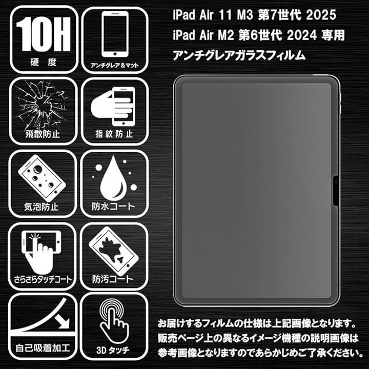「対応機種」iPad Air 11 M3 第7世代 2025 用/ipad air 11インチ M2 第6世代 2024 用「仕様」*本製品は国産AGC旭硝子素材を使用して中国の委託工場にて生産及び加工を行っております、 非光沢 アンチグレア マット仕上げ 表面硬度10H 薄さ0.33mm 指紋防止 防汚コート 飛散防止処理 自動吸着 3Dタッチ感度対応。