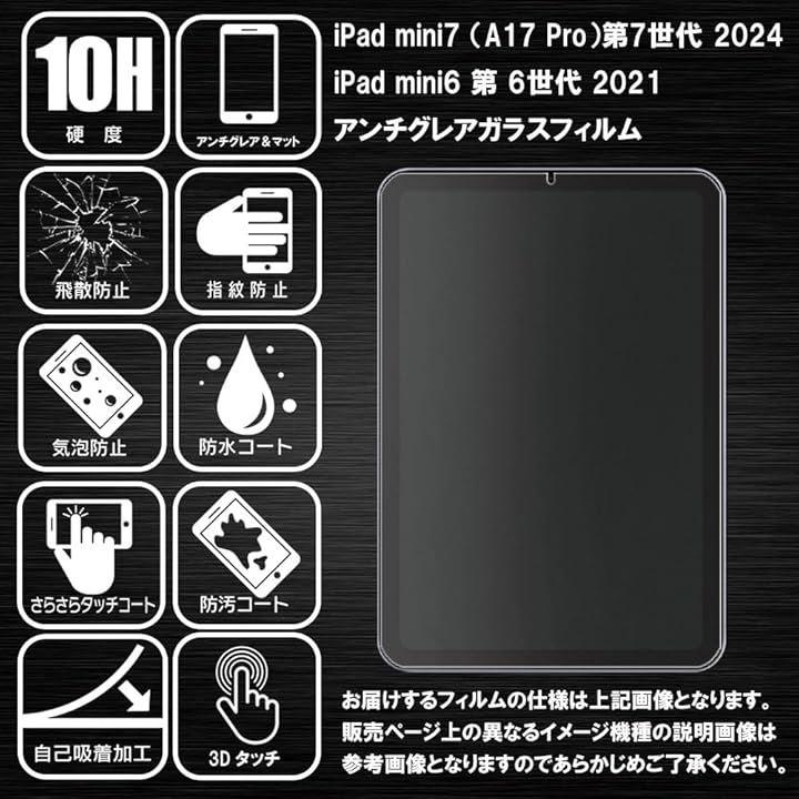 「対応機種」iPad mini7(A17 Pro)第7世代 2024用 / iPad mini6 第 6世代 2021 用「仕様」*本製品は国産AGC旭硝子素材を使用して中国の委託工場にて生産及び加工を行っております、 非光沢 アンチグレア マット仕上げ 表面硬度10H 薄さ0.33mm 指紋防止 防汚コート 飛散防止処理 自動吸着 3Dタッチ感度対応。