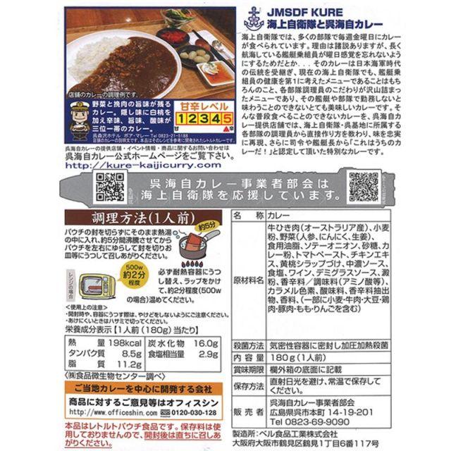 商品名:海上自衛隊 カレー レトルト 【 呉海自カレー ( 訓練支援艦くろべ ))】 非常食 詰め合わせ制作協力:海上自衛隊 呉地方総監部海上自衛隊呉基地・艦艇のカレーが味わえると人気の「呉海自カレー」が家でも気軽に味わえるようレトルトパウチになって登場。海上自衛隊の艦艇で食べられているカレーと同じ味をいつでも楽しめます。訓練支援艦くろべのカレーは、溶け込んだ野菜の旨味と挽肉の旨味が残る一杯。隠し味に白桃を加え、辛味と甘味、酸味が三位一体になったクセになる味わいです。お土産としても人気です。【甘辛レベル 5】内容量:180g(1人前)