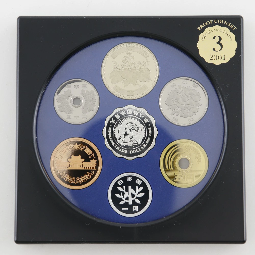 | 商品説明 | ◆「プルーフ貨幣セット」2001年 平成13年のものです。 ・年銘板は純銀製で貿易銀貨幣(明治8年)の表(おもて)図柄をデザインされたものが入っております。 ※コインの説明が書かれた栞が欠損しております。 |