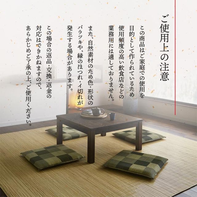 "国産い草を使用したい草座布団です。一本一本が太く、表皮が厚くキメが細かいので弾力性があり、耐久性に優れています。い草には湿度調整、消臭などの効果があります。中材はウレタンをフェルトで挟む三層構造になっており、クッション性がありへたりにくいです。い草には抗菌防臭効果があります。い草には汚れにくい性質があるので、定期的に乾いた雑巾や掃除機でゴミを取り除き、日陰干しをするだけで、お手入れ完了です。
