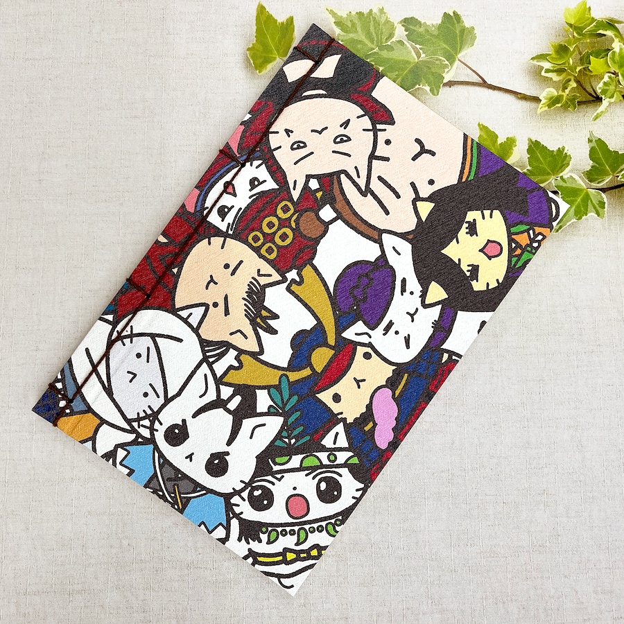 かわいい「ねこねこ日本史」のキャラクターをモチーフに片面には各キャラクターの名前が入ったオリジナルの和装ノートです。