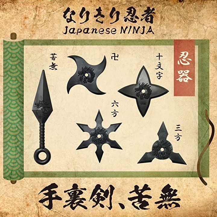 ・「忍者の飛び道具手裏剣&苦無」忍者の飛び道具で知られる手裏剣が4種類(、十文字、三方、六方)と剣先が柔らかくなっている苦無がセットになっています。