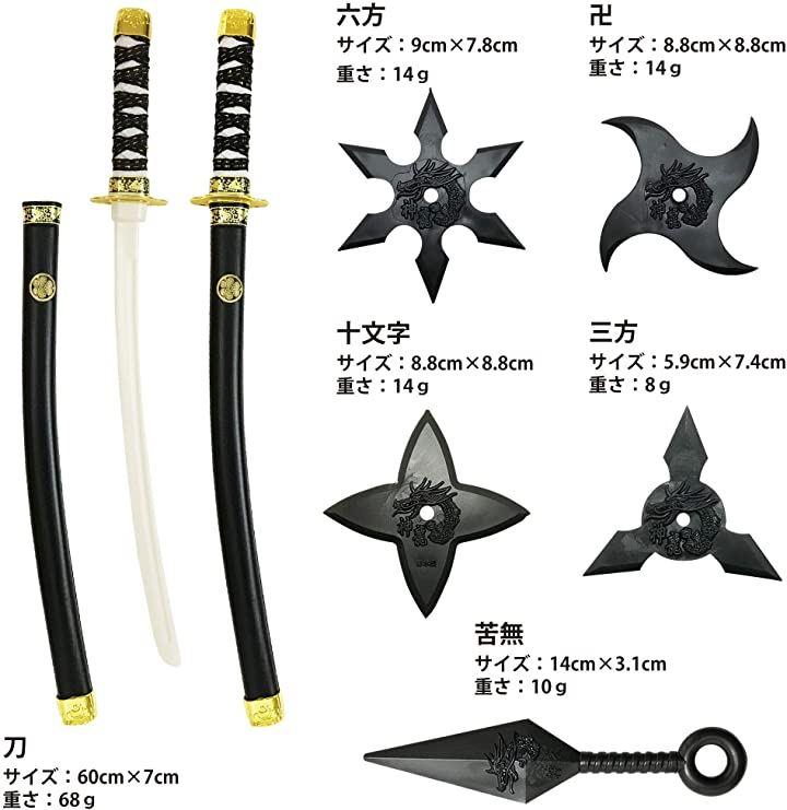 ・「詳細」刀:約60cmx7cm 約68g / 手裏剣:約8.8cmx8.8cm 約14g、十文字約8.8cmx8.8cm 約14g、三方約5.9cmx7.4cm 約8g、六方約9cmx7.8cm 約14g、苦無約14cmx3.1cm 約10g
