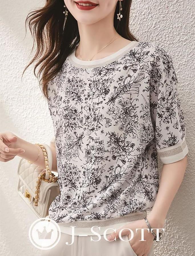 「シックxアクティブ。大人のための洗練Tシャツ」 ブラックの繊細なフラワープリントがホワイト地に映える、エレガントでシックな1枚。