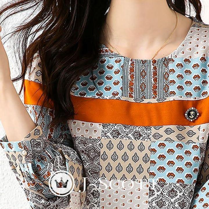 ベージュや水色をベースにオレンジブラウンを効かせて、パッチワークのようにランダムにつなぎ合わせたプリントが優雅でシックに映えます。