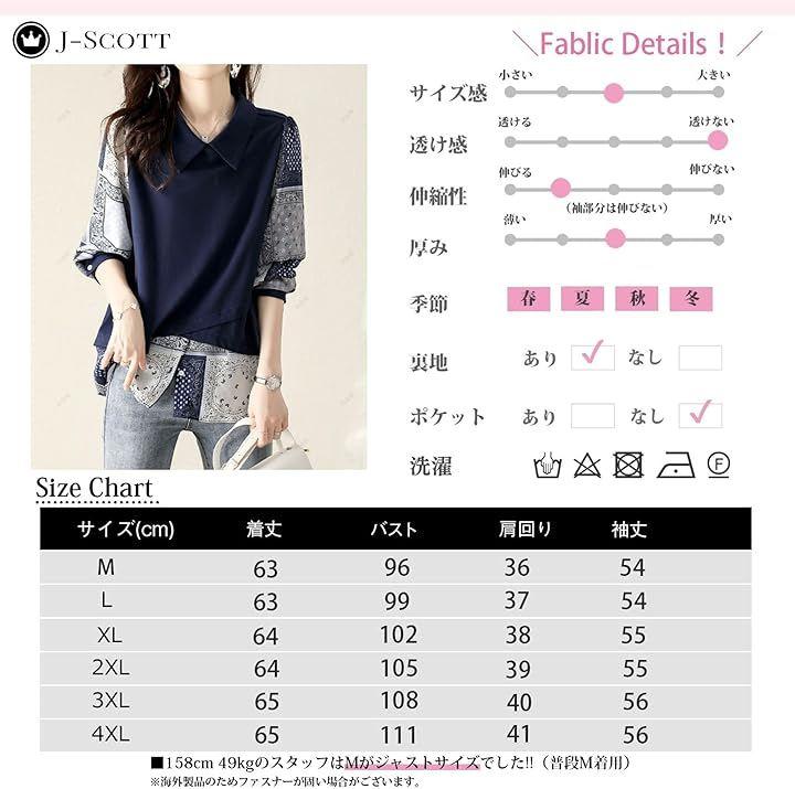 着丈/バスト/肩回り/袖丈 M:63/96/36/54 L:63/99/37/54 XL:64/102/38/55 2XL:64/105/39/55 3XL:65/108/40/56 4XL:65/111/41/56 *158cm/49kgのスタッフの場合:Mがジャストサイズでした(普段M着用)