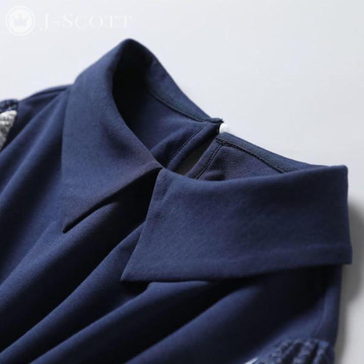 襟付きの首元がきちんと感をプラスし全体を引き締めるアクセントに。