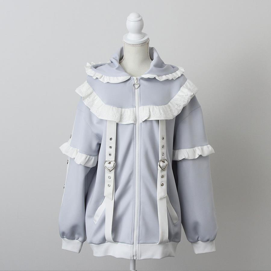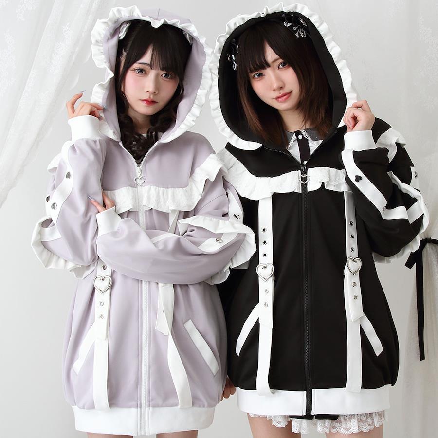 カラー展開豊富♪可愛すぎるジャージパーカーワンピース登場【デザイン】少し大きめのシルエットとなっております。身頃部分はベルトが付いた仕様になっております。袖横にはハートスタッズがついております。フリルやかわいいレースがたっぷりと装飾されているので映えます。カラーはかわいい6色展開と豊富でお気に入りのカラーをお探しください。羽織りとしてはもちろん、ファスナーを閉めればワンピースとしても大活躍のアイテムです!【素材】さらっとした丁度良い厚さのジャージ生地を使用しています。【コーディネート】普段のかわいいコーディネートにだぼっと羽織ってコーデしてみてください♪カラーによってサブカル地雷にも天使界隈にもなれます。《透け感》なし 《生地の厚さ》普通 《裏地》なし 《伸縮性》ややあり《生産国》中国