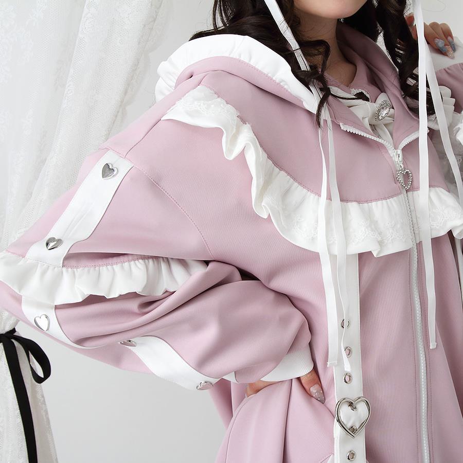 カラー展開豊富♪可愛すぎるジャージパーカーワンピース登場【デザイン】少し大きめのシルエットとなっております。身頃部分はベルトが付いた仕様になっております。袖横にはハートスタッズがついております。フリルやかわいいレースがたっぷりと装飾されているので映えます。カラーはかわいい6色展開と豊富でお気に入りのカラーをお探しください。羽織りとしてはもちろん、ファスナーを閉めればワンピースとしても大活躍のアイテムです!【素材】さらっとした丁度良い厚さのジャージ生地を使用しています。【コーディネート】普段のかわいいコーディネートにだぼっと羽織ってコーデしてみてください♪カラーによってサブカル地雷にも天使界隈にもなれます。《透け感》なし 《生地の厚さ》普通 《裏地》なし 《伸縮性》ややあり《生産国》中国
