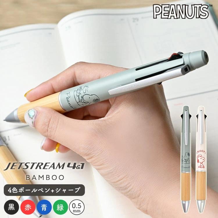 【ジェットストリーム 4&1 BAMBOO】ボールペン4色(黒・赤・青・緑)とシャープの機能が揃った多機能ペン。なめらかな書き味で大人気の『ジェットストリーム』に、美しく耐久性を兼ね備えた天然竹製グリップ『BAMBOO(バンブー)』シリーズが新登場!シンプルなスヌーピー柄と落ち着いたくすみカラーで、ナチュラルな雰囲気が魅力のデザインです。学生さんはもちろん、職場用ステーショナリーにもぴったり。プレゼントやギフトにも◎