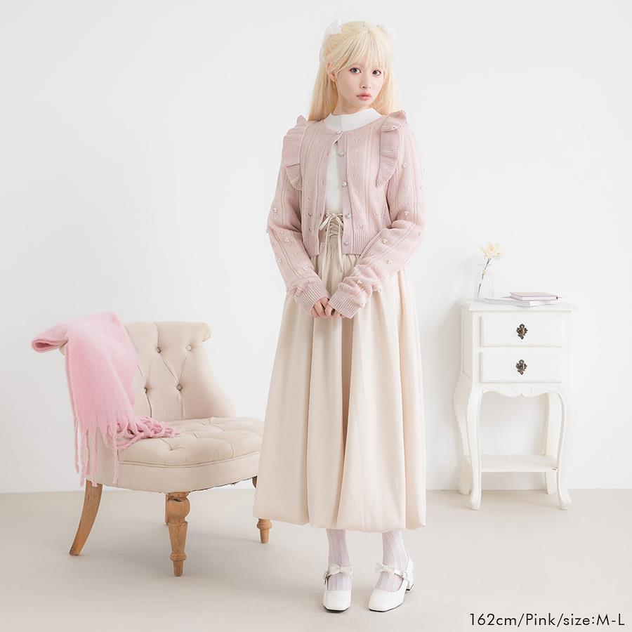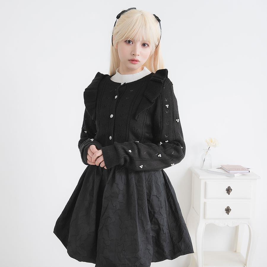 上品なパールビジュー釦のフリルニットカーディガンのご紹介。