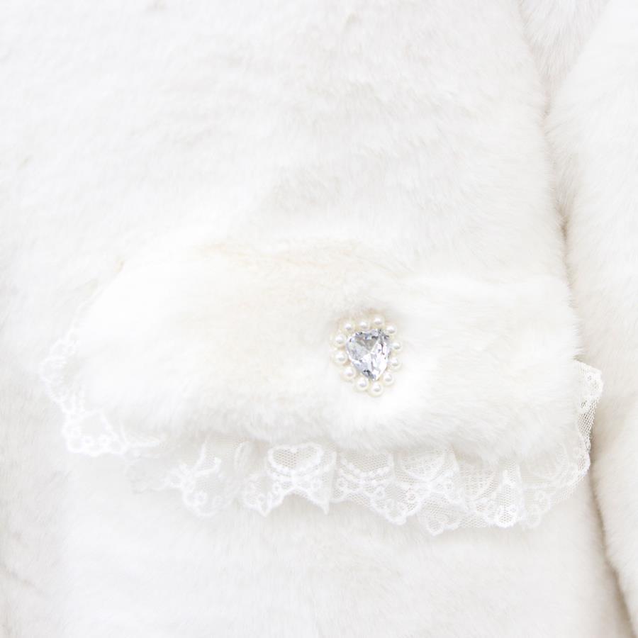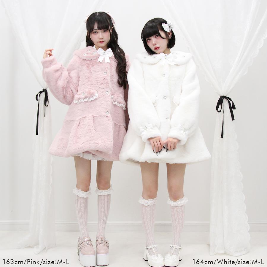 キラキラビジューが散りばめられたふわふわのかわいいファーコート【デザイン】襟元の大きめキラキラビジューが散りばめられたかわいいファーコートです♪ボタンにもかわいいハートパールビジューがポイントに♪ボタンはスナップボタンで楽ちんに着脱できます。ふわっとひろがるデザインでどんなお洋服にも合わせられるコートです。【素材】ファー素材を使用しています。裏地は中綿キルティング仕様になっています。【コーディネート】量産型コーデや甘めロリータ系コーデにぴったりのファーコートです。おもわず抱きしめたくなるくらいかわいいボリューム感がたまらない♪《透け感》なし 《生地の厚さ》厚手 《裏地》あり 《伸縮性》なし《生産国》中国