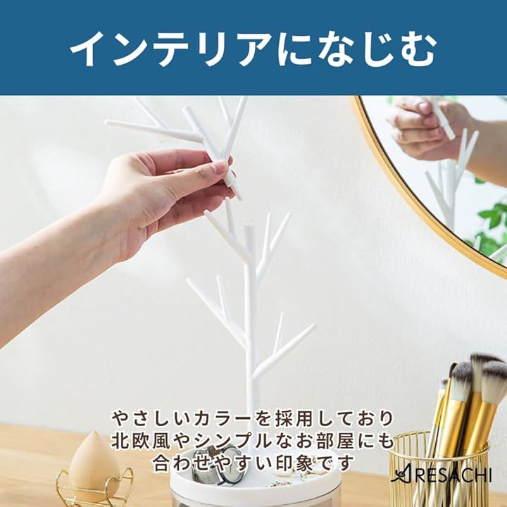 「ツリー型で見やすく、選びやすいデザイン」枝のように広がるツリー型デザインのため、ネックレスやピアスをひとつずつ掛けて整理しやすくなっています。