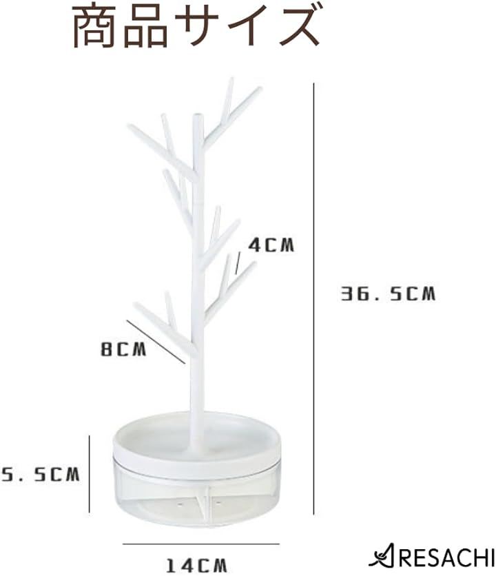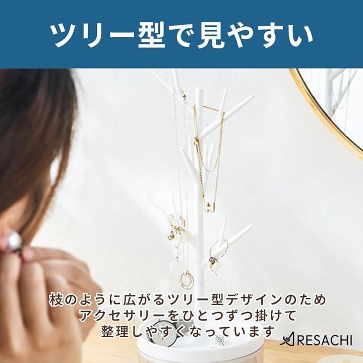 「ツリー型で見やすく、選びやすいデザイン」枝のように広がるツリー型デザインのため、ネックレスやピアスをひとつずつ掛けて整理しやすくなっています。