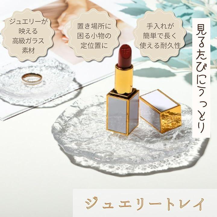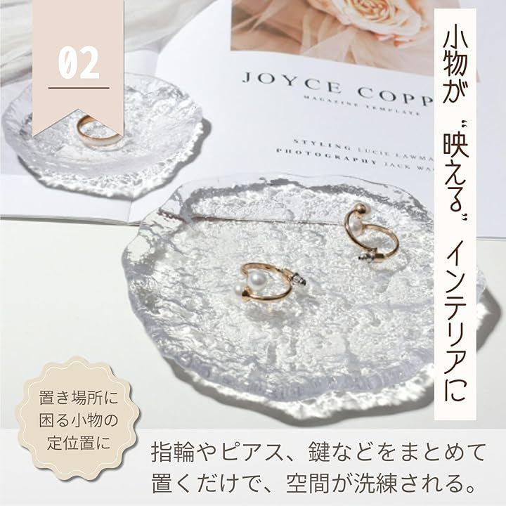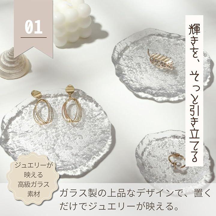 「ジュエリーが映える高級ガラス素材」 透明感のある高品質なガラス素材が、ジュエリーやアクセサリーを美しく引き立てます。