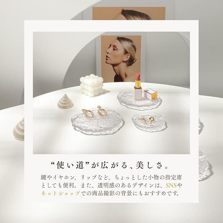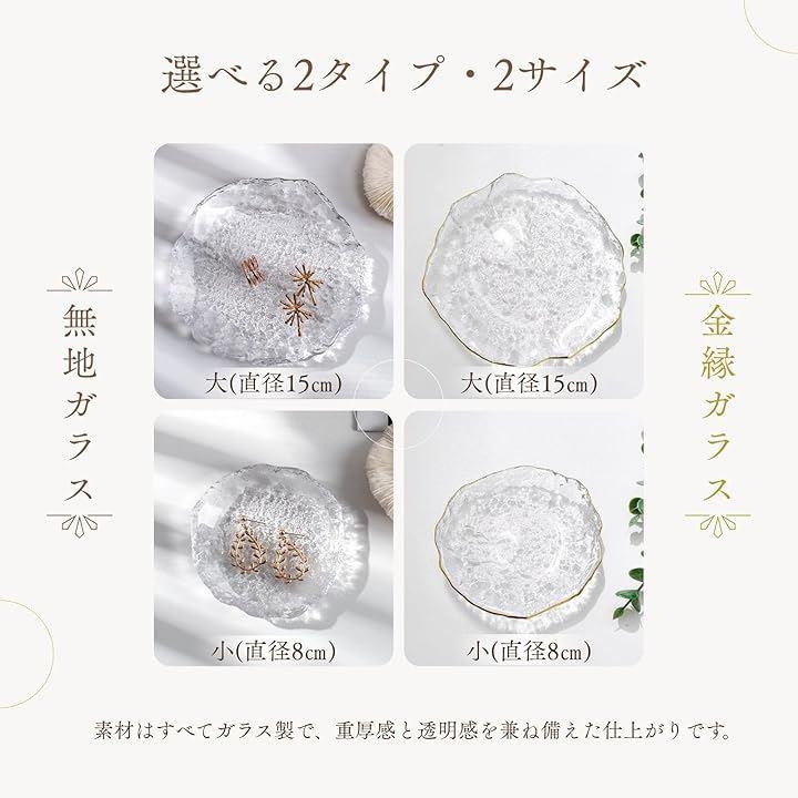 「サイズ・仕様」「サイズ」小:直径約8cm、大:直径約15cm「バリエーション」無地ガラス、小/大、金縁ガラス、小/大「材質」ガラス「特徴」透明感、凹凸デザイン、撮影小物にも最適「適用」アクセサリー置き、小物収納、プレゼント用、インテリア装飾に最適