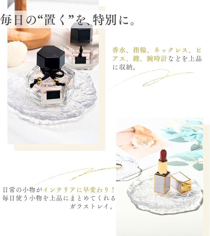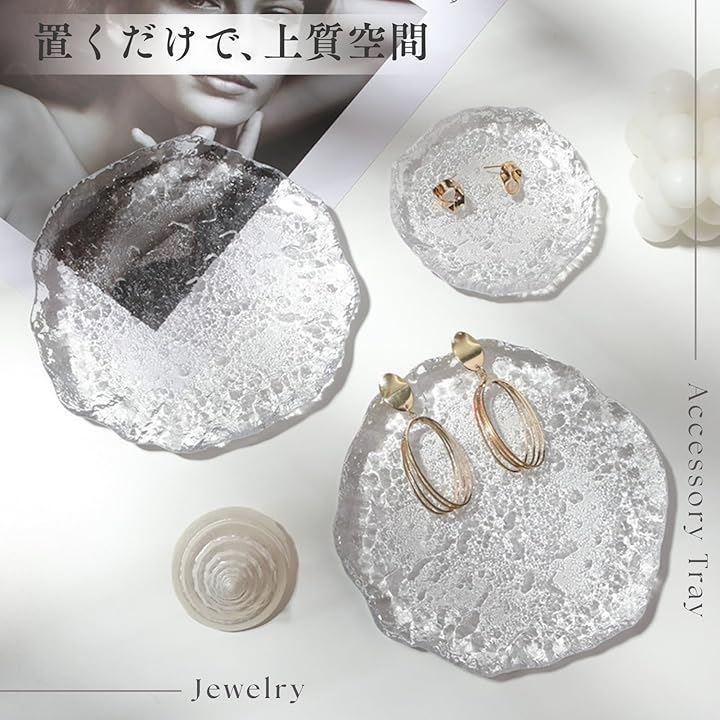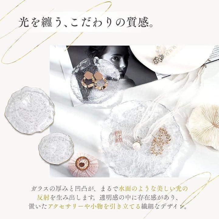 「透明感と高級感を兼ね備えたガラス製ジュエリートレイ」厚みのあるガラスが光を美しく反射し、まるで水面のような透明感を演出。