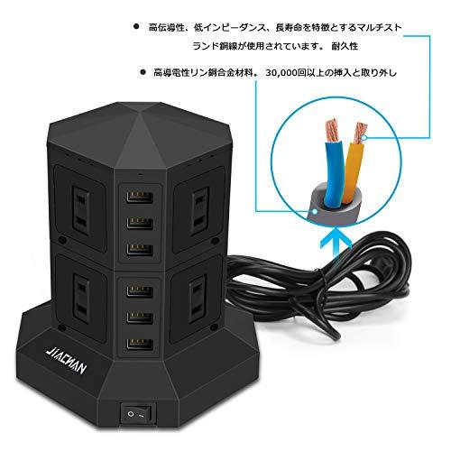 ●【ユニークなデザイン】JIACHAN製品の利点。 日本標準のジャックとプラグ。 垂直ソケットは、設置面積が小さいことが特徴です。 混乱を解決します。 また、各層のジャックには独立したスイッチ制御があります。 エネルギーを節約します。 電源コードは、太い蛍光体銅導体を使用しています。 ハイパワー機器を使用する際に電線が熱くなる可能性を防ぎます。●【製品の特徴】JIACHANタワー電源ボードには過負荷保護機能があります、雷保護、および雷保護があります。異常状況下の電源保護(例えば、過負荷、過熱、過電流、過充電、異常温度、雷サージ)電源タップは自動的にオフにします。黒いボタンを押せば再度使用できます。ご注意ください。トラッキング現象による火災を防ぐ絶縁94V0規格PC素材を採用し万一発熱した場合でも融解しにくく、電気火災を防止します。突然の落雷による雷サージから、パソコンやAV機器などの精密機器を守る雷ガードタップです。●【頼りになる品質】本体は難燃性が最高クラスのPC樹脂素材と高品質の銅導体を採用し、電気火災の防止に有効です。そして、過負荷保護の回路デザイン及び防火材料により、過熱、過電流、ショートなどから充電した家電やデバイスを守ります。●【たっぷり!充電口】新型のタワー型デザインのJIACHAN電源タップは8個AC電源口と6つのUSBポートまで持っています。タブレットやスマホ、パソコン、小家電など同時に複数のデバイスに充電する可能です。タワーデザインの場合、電子機器が互いに干渉せずに使用できて、機器のコードは絡んだりすることが発生しませんというメリットもあります。●【PSE認証済】JIACHANタワー電源タップはPSE認証を取得し、関東経済産業省から届出済、安心してお使いいただける正規品です。(1年間の保証)保証期間以内何か品質の問題が起こったら、ぜひお気軽にメールにてご連絡くださいますようお願い申し上げます。