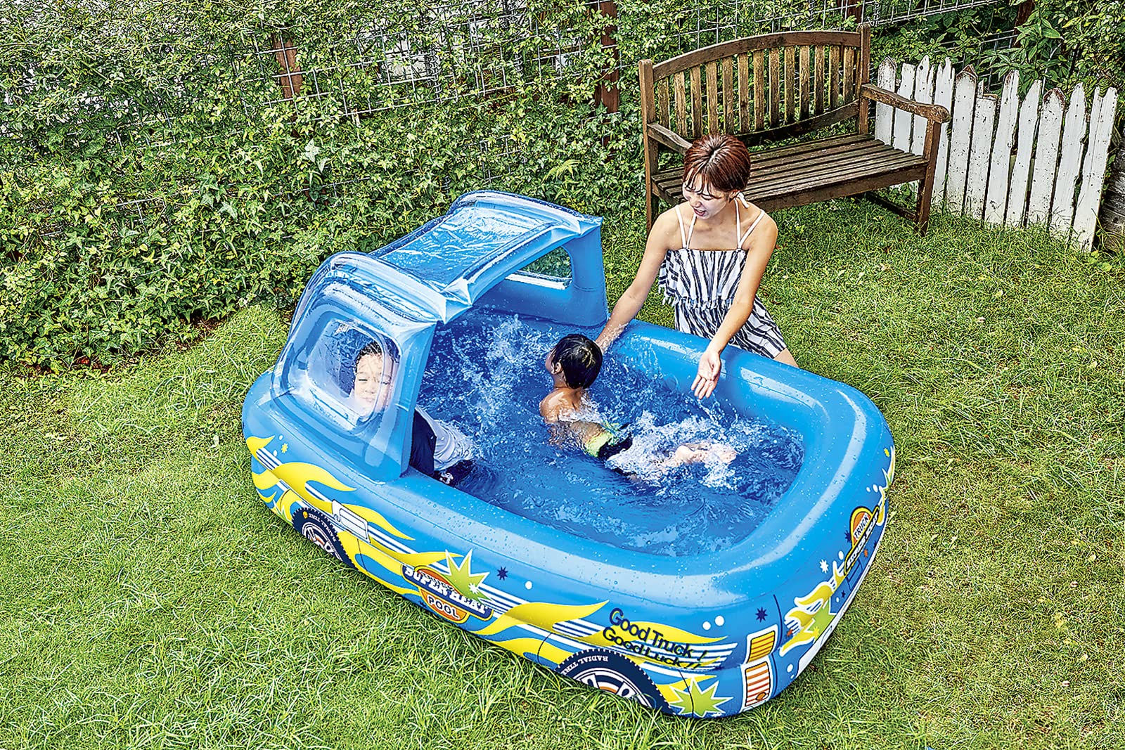 海外のインフレータブルブランド「JILONG」のプールです。 ピックアップトラックをモチーフにしたユニークなプールです。 膨らんだ状態のプール本体の長さは約195cm、幅117cm、高さ90cmです。 このプールには空気の注入、排出が容易な大型の空気栓が取り付けられています。 空気注入には電動ポンプのご使用をおすすめします。 水の使用量の目安は約340Lです。 空気栓の数:本体 大型空気栓×1 屋根 通常空気栓×3 水抜き栓付き 対象年齢6歳以上 膨らんだ状態のプール本体の長さは約195cm、幅117cm、高さ90cmです。 水の使用量の目安は約340Lです。 素材: ポリ塩化ビニル 商品の形状: 長方形