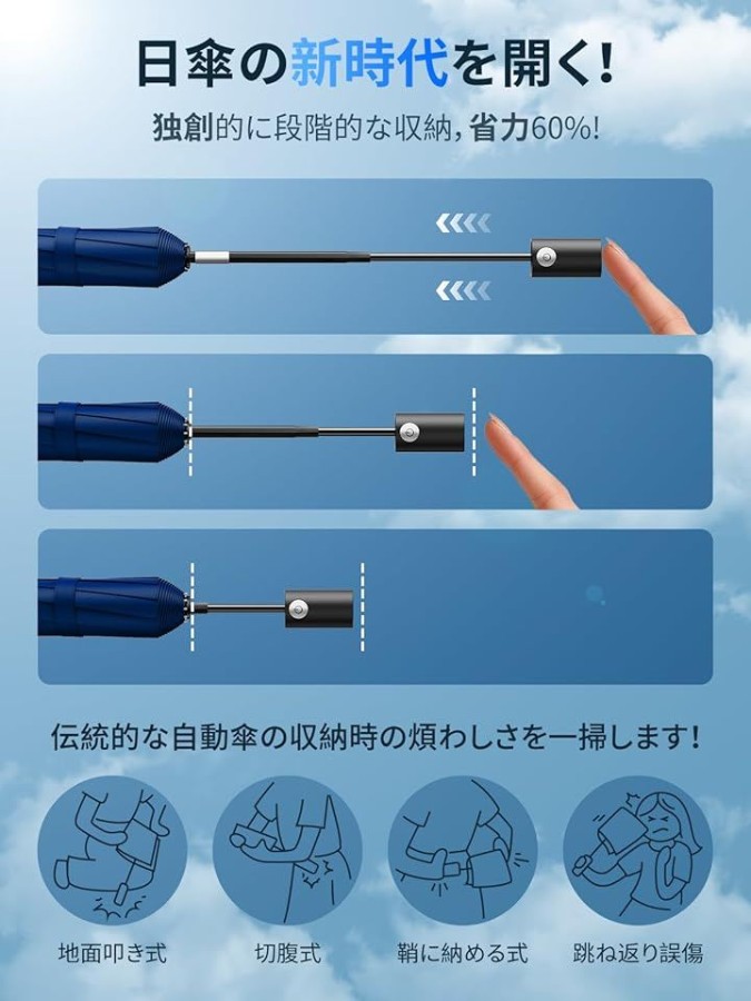 伝統的な自動傘の収納時の面倒さ(地面に叩く方法、切腹式収納、鞘に入れる方式、跳ね返りによる誤傷など)を一掃します。」