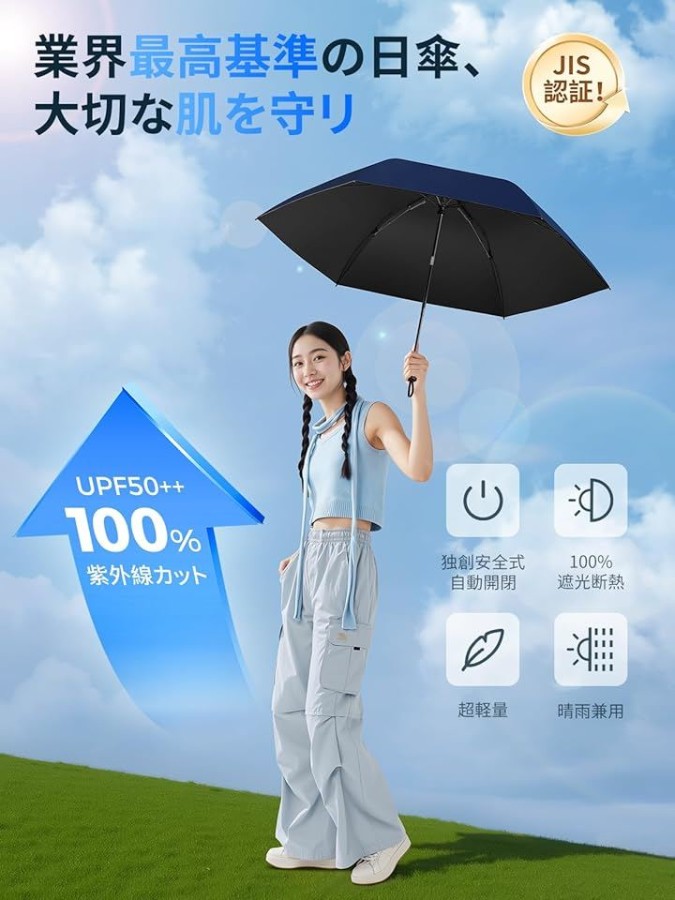 「JIS認証日傘・100%UVカット・100%遮光遮熱」UPEBの折りたたみ日傘は、一般の基準を100倍上回るJISの専門認証を獲得しています。