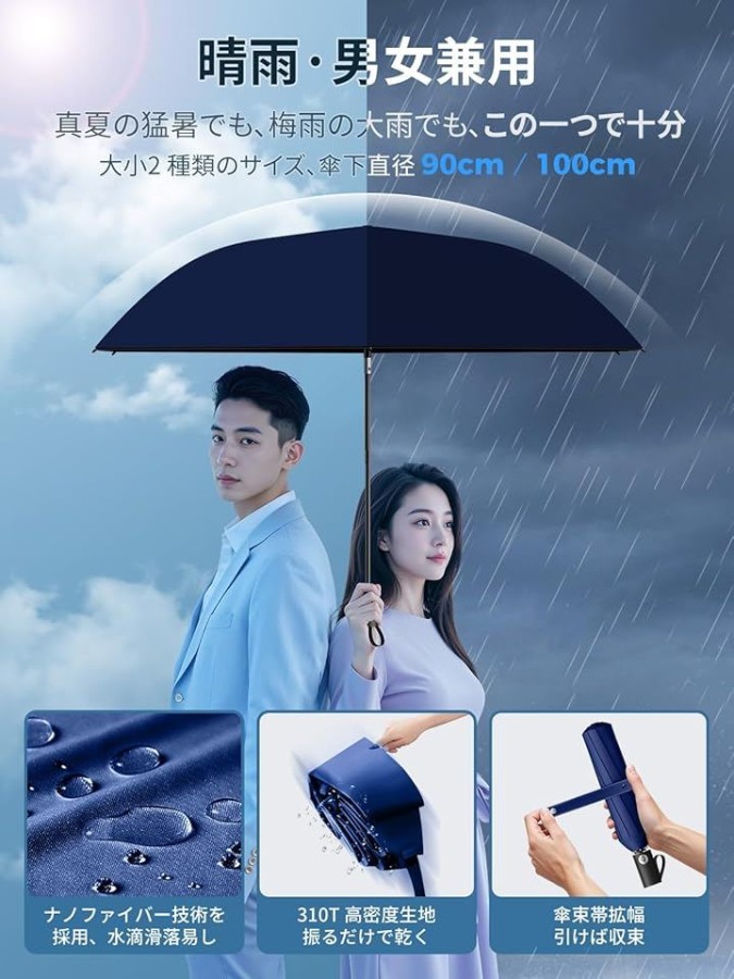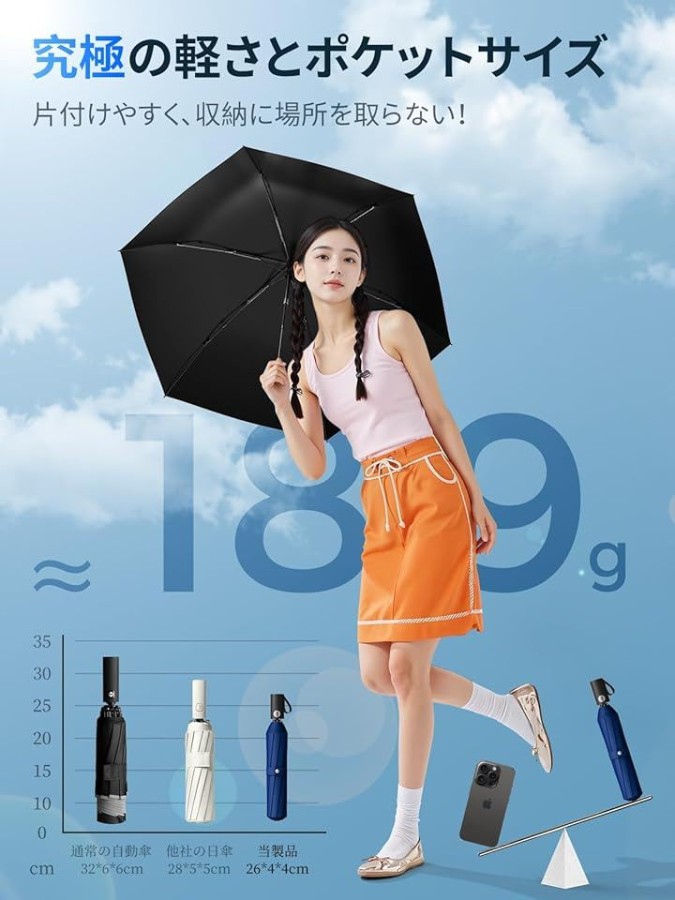 折りたたんだ厚さはわずか4cm、長さは25.5cm、重さは約188g、毎日の持ち運びに最適。 通勤・通学、旅行、ハイキング、スポーツなど、あらゆるシーンで幅広く利用でき、老若男女問わず幅広い世代の方々にご利用いただけます。繊維ナノテクノロジーを採用し、310T 高密度の傘生地を使用しています。