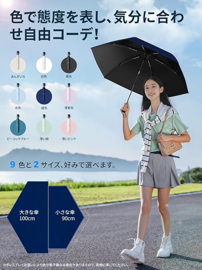「大小2 種類のサイズ、傘下直径 90cm/100cm・9 色から選べます」90cm の小サイズは軽量で持ち運びが簡単で、いつでもどこでも風や雨を遮ってくれます。
