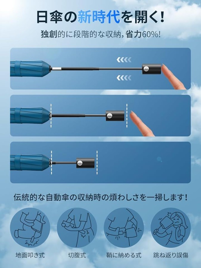 伝統的な自動傘の収納時の面倒さ(地面に叩く方法、切腹式収納、鞘に入れる方式、跳ね返りによる誤傷など)を一掃します。」