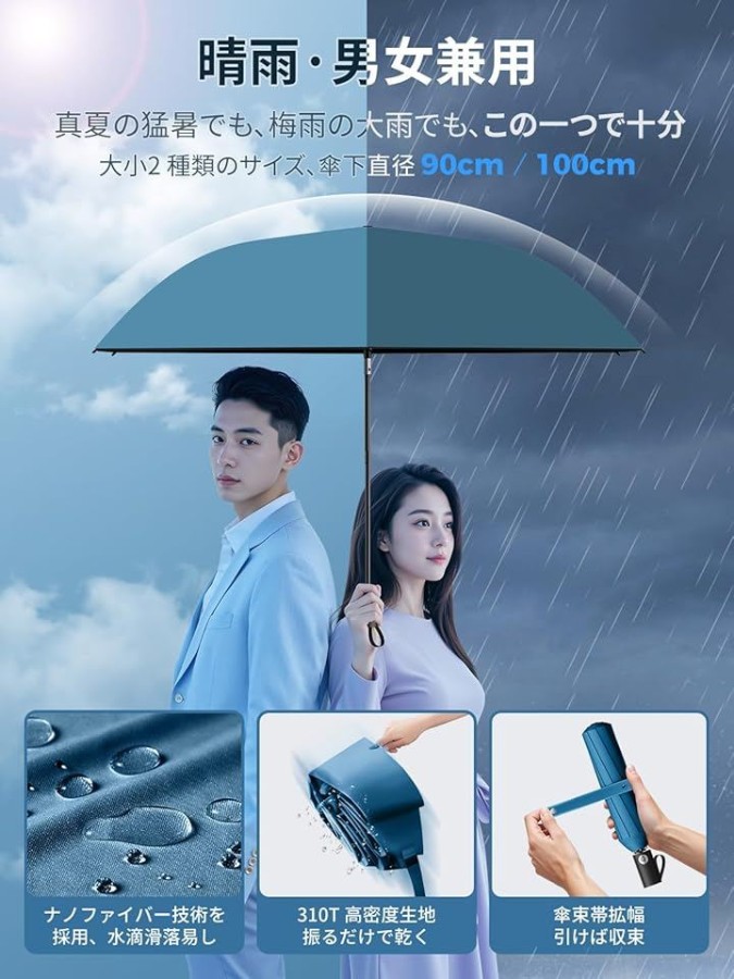 折りたたんだ厚さはわずか4cm、長さは25.5cm、重さは約188g、毎日の持ち運びに最適。 通勤・通学、旅行、ハイキング、スポーツなど、あらゆるシーンで幅広く利用でき、老若男女問わず幅広い世代の方々にご利用いただけます。繊維ナノテクノロジーを採用し、310T 高密度の傘生地を使用しています。