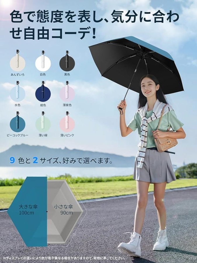 「大小2 種類のサイズ、傘下直径 90cm/100cm・9 色から選べます」90cm の小サイズは軽量で持ち運びが簡単で、いつでもどこでも風や雨を遮ってくれます。