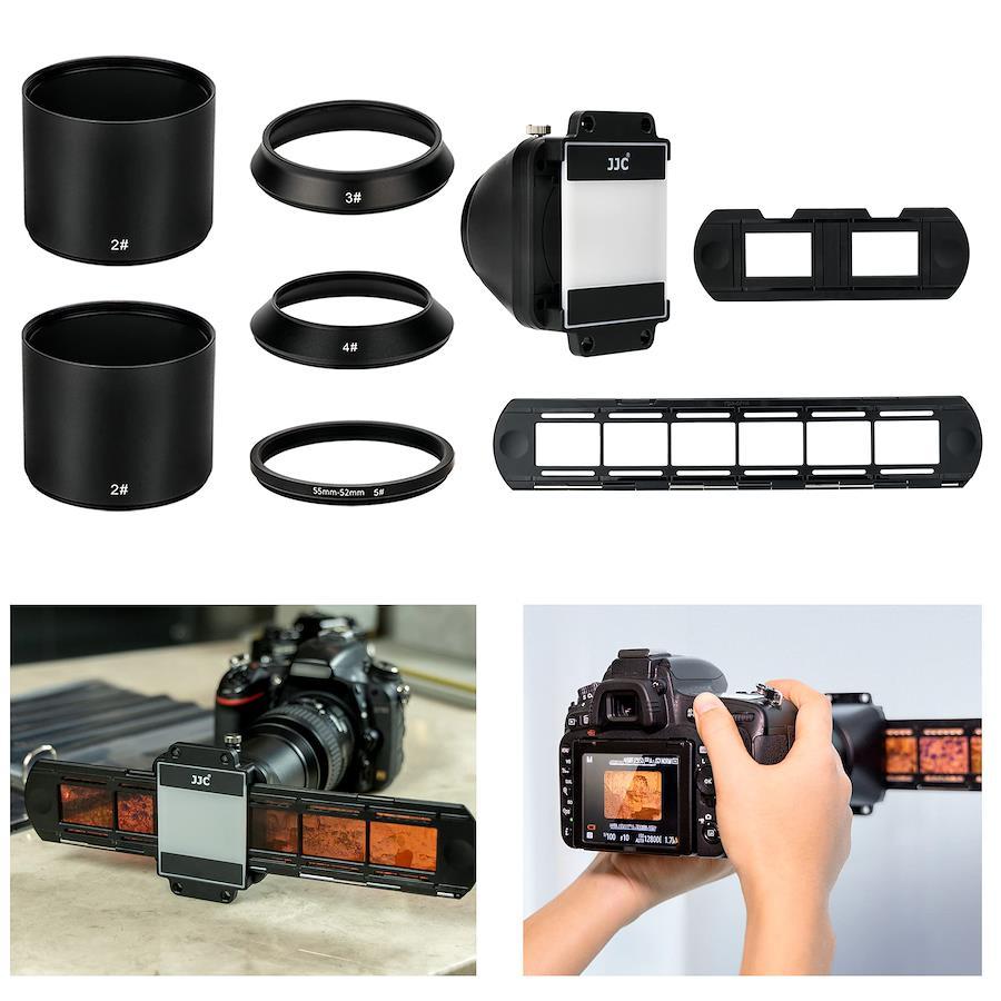 【フィルムデジタイズ】JJC フィルムデジタイズアダプターを使用して、フィルムスキャナーを使うよりも短時間で手軽に出来るようになります。 【適用フィルム】35mm判スライドマウントや35mm判ストリップフィルムを撮影するためにに使えます。 【広い互換性】本商品は口径変換アダプター(付属)の使用により、さまざまなレンズに取り付けることができます。 【使用便利】フィルムデジタイズアダプターの固定ねじを緩めるとフィルムホルダーの傾きを微調整できます。(Nikon D850お勧め,ネガフィルムデジタイズ機能がありますから) 【せット内容物】フィルムデジタイズアダプター x 1、52mm→52mm 径変換アダプター x 2、62mm→52mm 径変換アダプター x 1、67mm→52mm 径変換アダプター x 1、55mm→52mm 径変換アダプター x 1、スライドマウントホルダーX1、ストリップフィルムホルダーX1、説明書( 英語 )X1