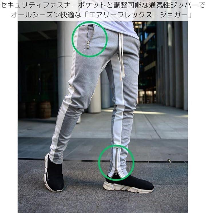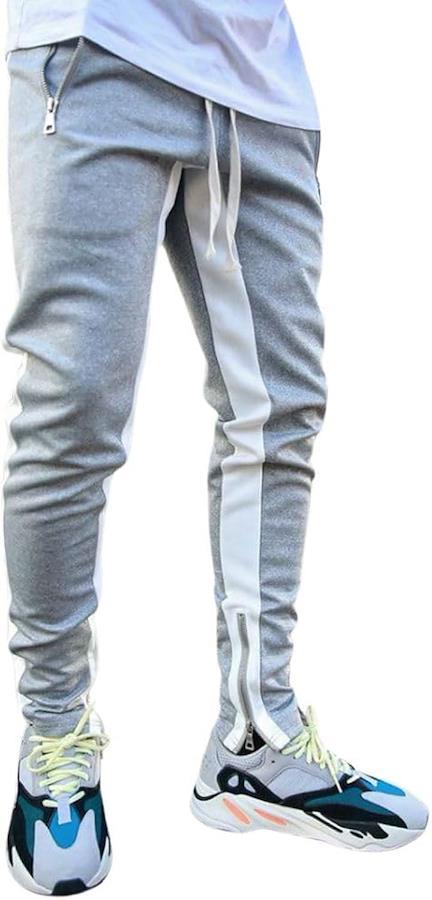 Jogger pants, zipper pockets to keep your valuables safe, zippers at the feet, comfortable all year round with zippers at the feet, drawstring waist, fitness, modern casual, side lines, gray & white