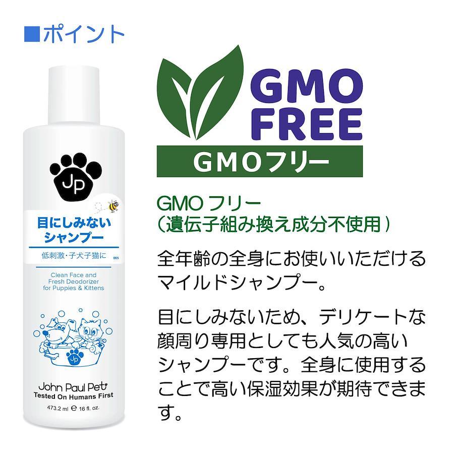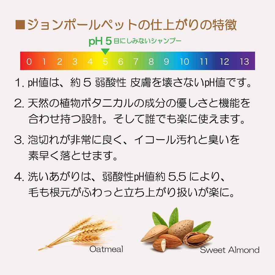 目の弱い子や洗顔用にオススメ ・低刺激で、デリケートな敏感肌をやさしくケア(全年齢使用可能) ・顔周りの浸け置きも可能 ・ベビーパウダーのようなやさしい香り ・涙と同じpHで低刺激のため、デリケートな子犬・子猫や目の弱い子、敏感肌もやさしくケアします。目にしみないため、涙やけの予防にも。 ・オートミール、スイートアーモンドオイル、アロエベラ配合で優れた栄養補給・保湿効果があります。 ・ベビーパウダーのようなやさしい香りが全身を包みます。 ・人がテストして安全性を確認しています。