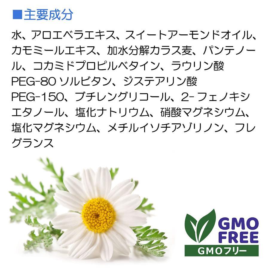 水、アロエベラエキス、スイートアーモンドオイル、カモミールエキス、加水分解カラス麦、パンテノール、コカミドプロピルベタイン、ラウリン酸PEG-80 ソルビタン、ジステアリン酸PEG-150、ブチレングリコール、2-フェノキシエタノール、塩化ナトリム、硝酸マグネシウム、塩化マグネシウム、メチルイソチアゾリノン、フレグランス