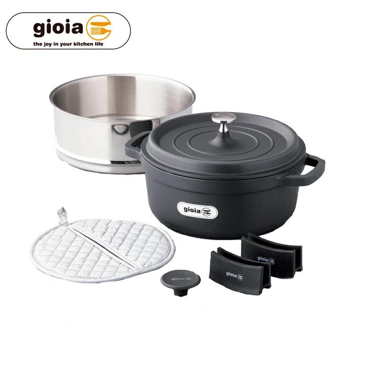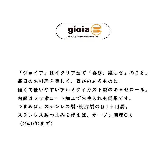 「ジョイア」はイタリア語で「喜び、楽しさ」のこと。毎日のお料理を楽しく、喜びのあるものに。軽くて使いやすいアルミダイカスト製のキャセロール。内面はフッ素コート加工でお手入れも簡単です。つまみは、ステンレス製・樹脂製の各1ヶ付属。ステンレス製つまみを使えば、オーブン調理OK(240℃まで)