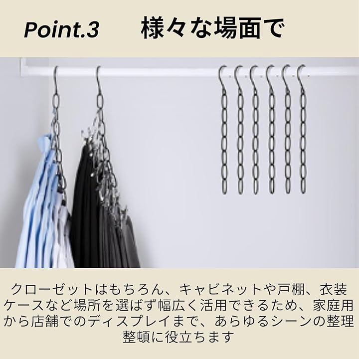 「様々な場面で」クローゼットはもちろん、キャビネットや戸棚、衣装ケースなど場所を選ばず幅広く活用できるため、家庭用から店舗でのディスプレイまで、あらゆるシーンの整理整頓に役立ちます。