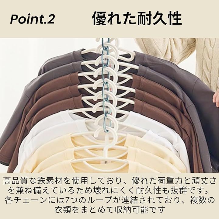 各チェーンには7つのループが連結されており、複数の衣類をまとめて縦に掛けることができ、限られたクローゼットのスペースを有効活用しながら、大切な衣類をしっかりとホルダーします。