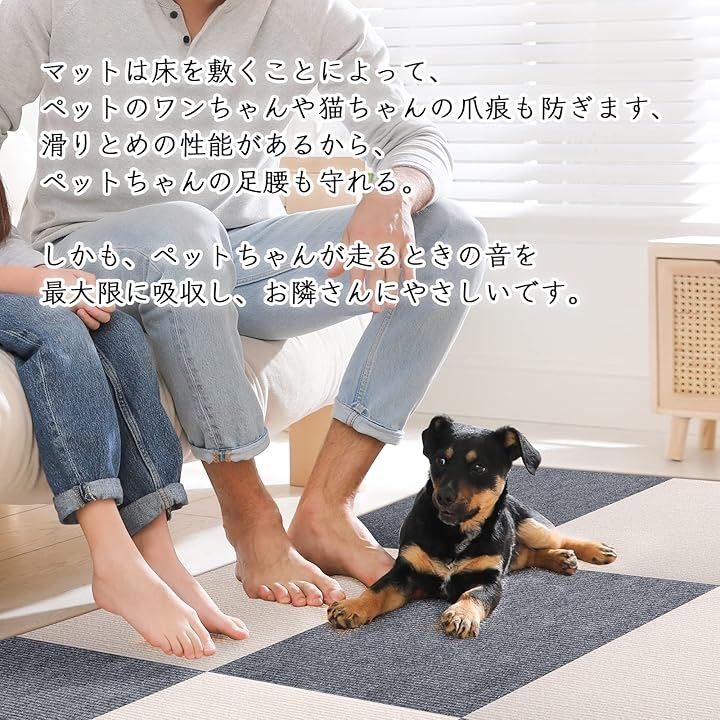 3、「床とたたみを守る、防音性も期待できる」マットは床を敷くことによって、ペットのワンちゃんや猫ちゃんの爪痕も防ぎます、滑りとめの性能があるから、ペットちゃんの足腰も守れる。