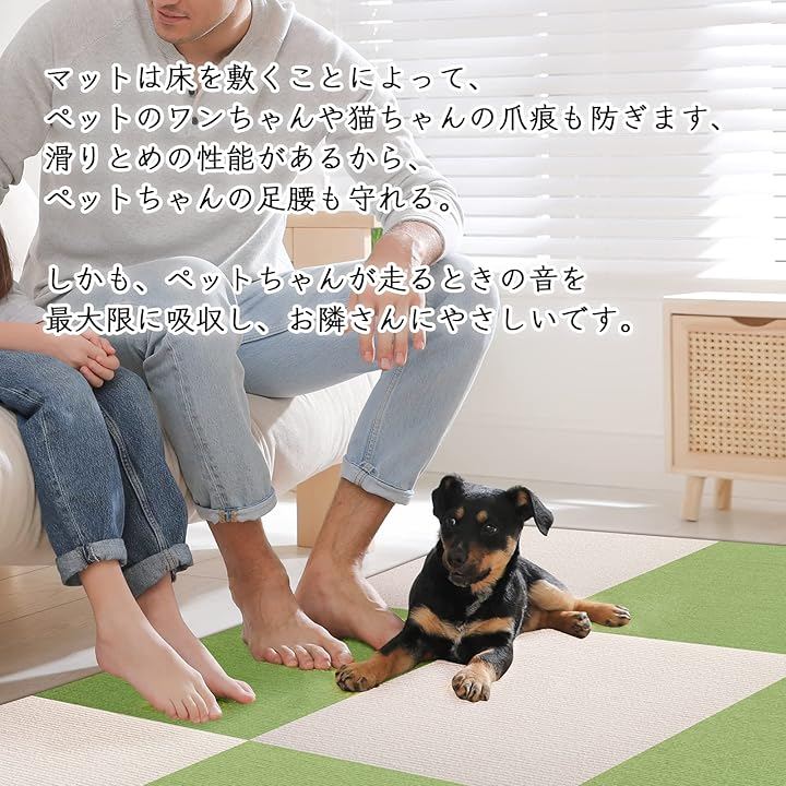 3、「床とたたみを守る、防音性も期待できる」マットは床を敷くことによって、ペットのワンちゃんや猫ちゃんの爪痕も防ぎます、滑りとめの性能があるから、ペットちゃんの足腰も守れる。
