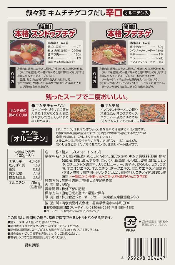 味噌と唐辛子味ベースのストレートタイプのキムチチゲ。100g当り エネルギー43kal、たんぱく質1.9g、脂質0.8g、炭水化物7.1g、食塩相当量2.8g原材料: みそ(国内製造)、おろしにんにく、還元水あめ、キムチ調味料(野菜・魚介発酵液、食塩、還元水あめ、にんにく、醸造酢、その他)、砂糖、食塩、しょうゆ、 コチュジャン調味料、りんごピューレ―、唐辛子、おろししょうが、ごま油、オニオンエキス、オルニチン、ポークエキス、ほたてエキス/調味料(アミノ酸等)、 増粘剤(キサンタンガム)、着色料(カロチノイド、紅麹)、酸味料、(一部にかに・小麦・いか・ごま・大豆・豚肉・りんごを含む)ブラント名: 叙々苑メーカー名: 叙々苑【重要】メーカーによる商品リニューアルに伴いパッケージ(内容量も含む)変更が行われた場合、新パッケージでお届け致します事ご了承願います。