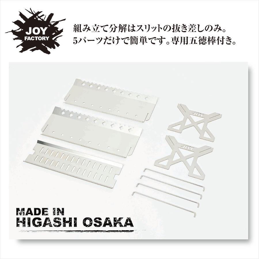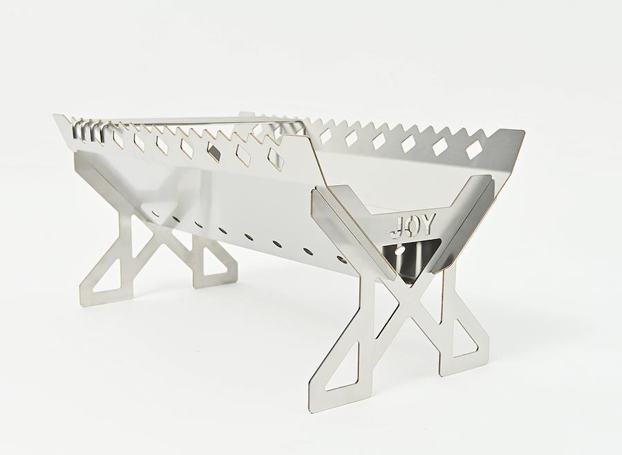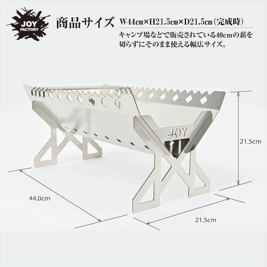 東大阪の工場で製造 金属加工のプロフェッショナルが作り上げた焚き火台焚き火や料理など、アウトドアのどんなシーンも華やかに演出してくれます。キャンプ場などで販売されている40cmの薪を切らずにそのまま使える幅広サイズ。組み立て分解はスリットの抜き差しのみで簡単です。ステンレス製で錆びに強く、永く愛用していただけます。 使い続けるにつれて現れる、ステンレスの質感をお楽しみください!! ステンレスは1.5mm厚でとても丈夫です。専用ごとく棒が4本付属するのでケトルや鉄板、焼き網を乗せて調理やBBQにも使用できます。 ダッチオーブンも安心して乗せることができます。【商品サイズ】W44×D21.5×H21.7cm/【商品重量】約3kg【耐荷重】約10kg【材質】オールステンレス製(メタリック)【製造国】日本製