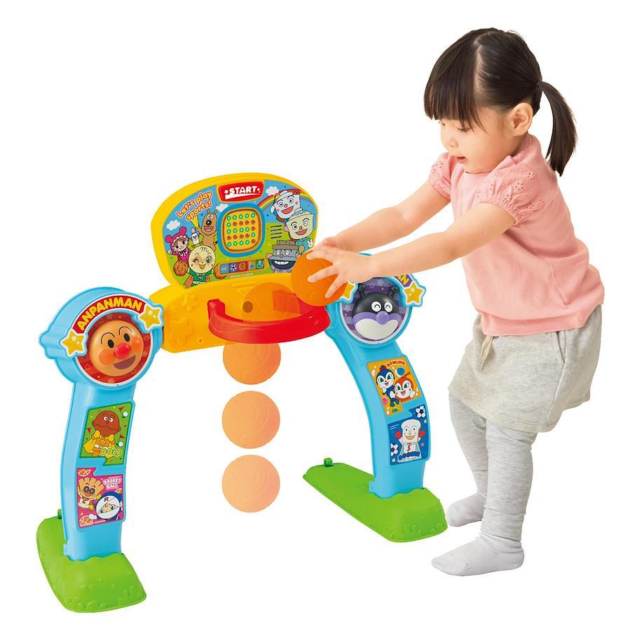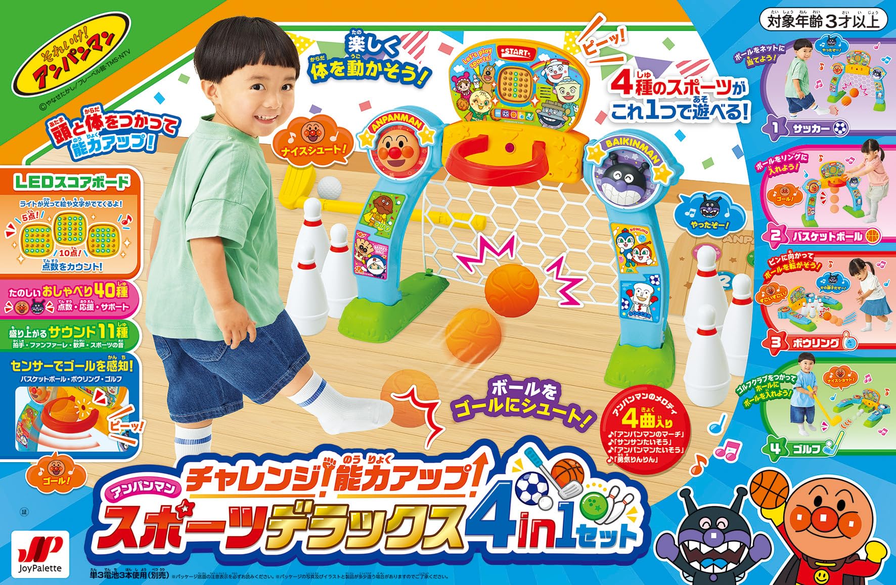 サッカー、バスケットボール、ボウリング、ゴルフ、4種のスポーツがこれ1つで遊べる! 頭と体をつかって能力アップ! 楽しく体を動かそう!センサーでゴールを感知しおしゃべりや効果音が流れます。点数をカウントしてLEDスコアボードに表示、やる気を促す工夫がされています。アンパンマンのメロディ4曲入り! (アンパンマンのマーチ、サンサンたいそう、アンパンマンたいそう、勇気りんりん)電池使用: 単3電池3本使用(別売)