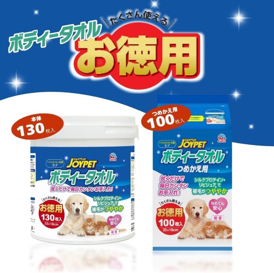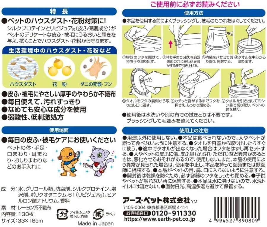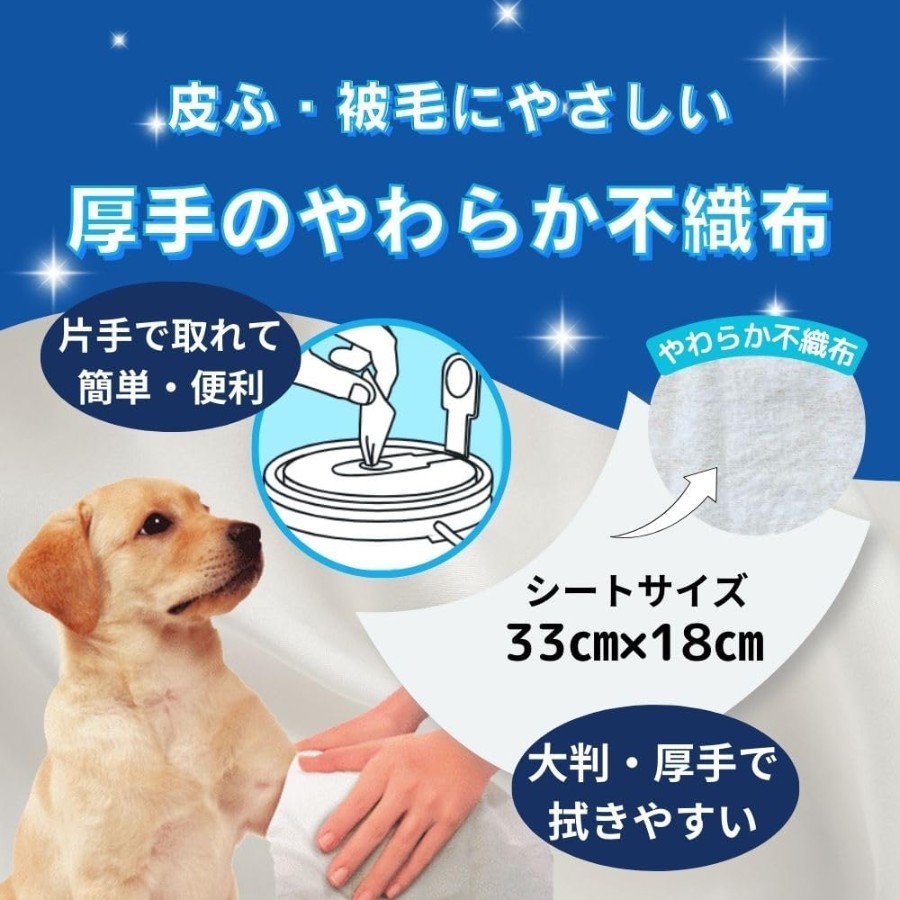 拭くだけで簡単にお手入れできるボディーシートの大容量タイプ。シルクプロテイン・リピジュア配合で皮膚・被毛にうるおいと輝きを与えます。やわらかなメッシュシートタイプ。なめても安心。1枚サイズ33×18cm