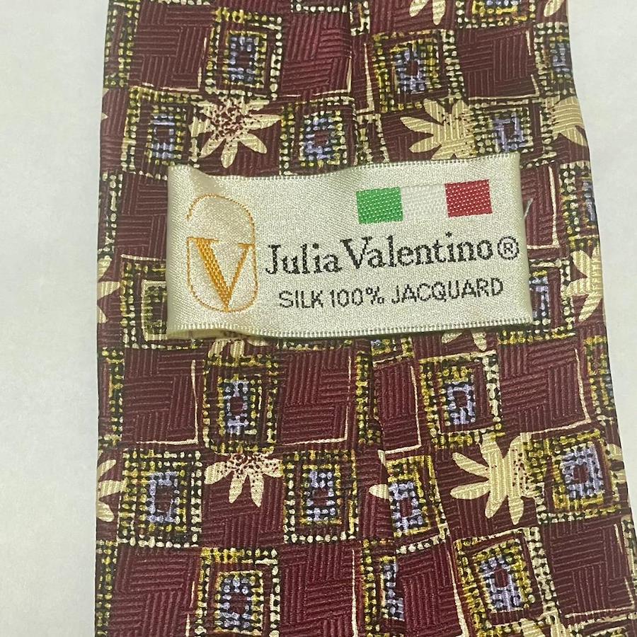 - ブランド: Julia Valentino- 素材: シルク100% ジャカード- デザイン: パターン入り(花柄)- 色: ワインレッドとゴールドの組み合わせ- サイズ: 標準的なネクタイサイズ
