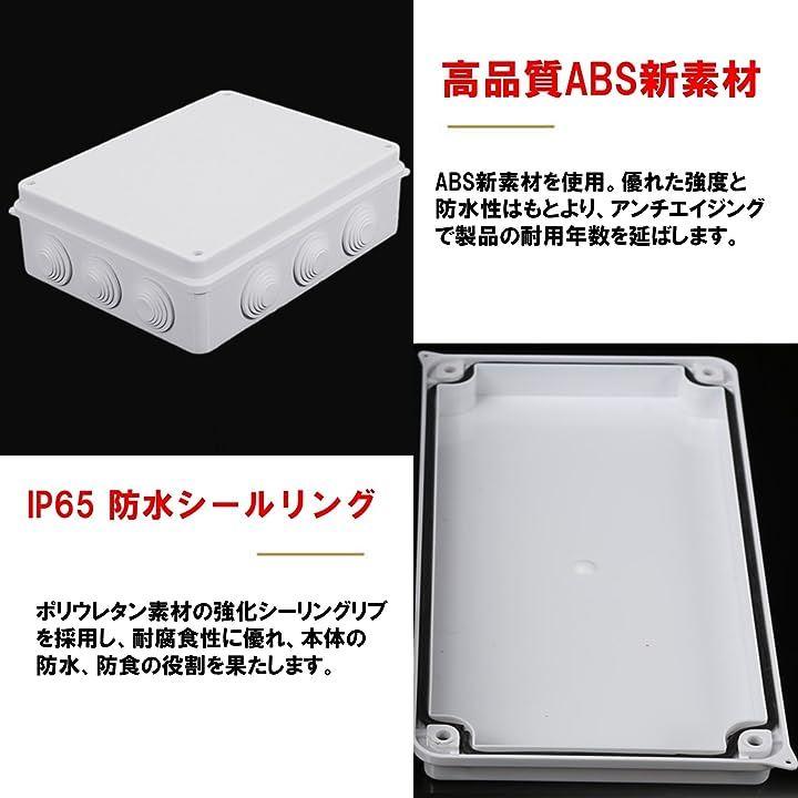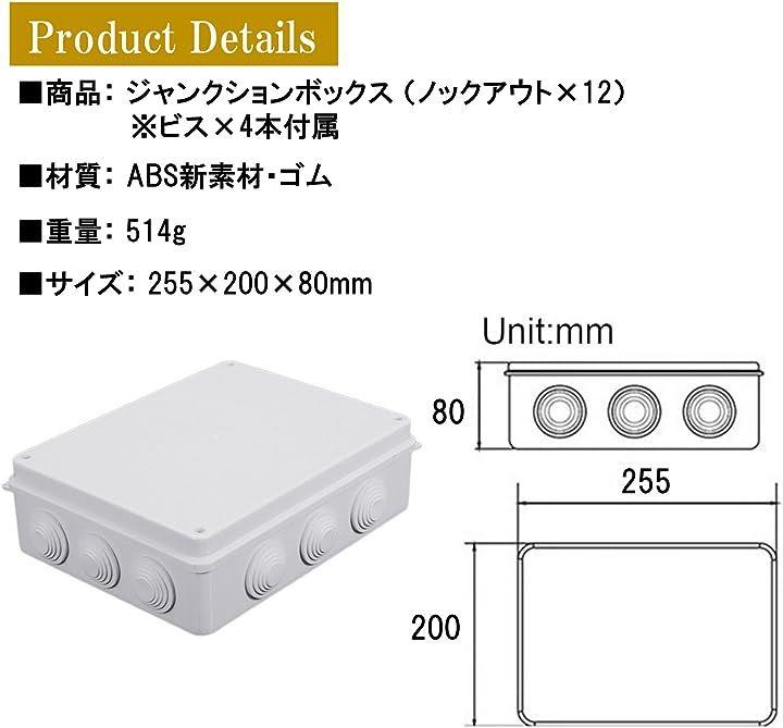 ・商品詳細: 防水ジャンクションボックス(ノックアウトx12)ビスx4付属 「サイズ」 255x200x80mm 「重量」 514g 「材質」 ABS新素材・ゴム