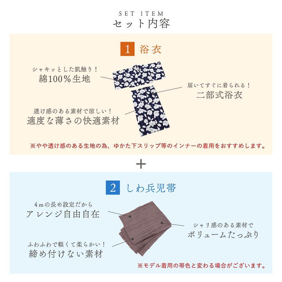 二部式浴衣としわ兵児帯 2点セットの商品です。その他の小物は付属しません。●帯に関しましては、当店スタッフのおまかせになります。※帯はモデル着用の帯を基本的には浴衣に合わせてコーディネイト致します。