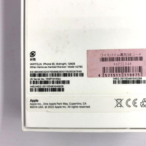 【品番】 MMYF3J/A【商品名】 Apple iPhone SE 第三世代 128GB ミッドナイト【IMEI】 351153481646828【利用制限】 ○【OS】 iOS 18.6.2【付属品】 箱・冊子類・SIMピンお買い上げされた商品の初期不良に伴って発生した各種損害につきましては、一切の責任を当社は負いかねます。契約事務手数料、SIMロック解除手数料等、各キャリアとお客様の間で発生する諸費用につきましては返金できません。上記内容をあらかじめご了承ください。[ジャンク品・ジャンク扱い品の説明]ジャンク品:動作の確認が全くできないもの・不良品ジャンク扱い品:動作の確認が一部できないもの・一部不良品本来の商品として成り立たない商品。傷・汚れ・折り目・割れ・劣化・改造・変形・破損等のダメージがある物になります。クリーニング・メンテナンスはしていません。